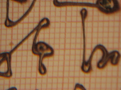 this was writ on heat transfer paper, maybe EKG paper, i dunno, i found a big ream of it at the junkstore a couple of years ago, my flatmate asked me "what are you going to do with that? " i shrugged, i didn't even know what it was -- by accident of tossing a still-warm matchstick onna page i discovered what it was -- i did a whole series of stove-top circle burns, it was an electric stove with spiral eye, the fumes are noxious, probably cancer inducing, i made the spiral series into wallpaper, you can also use certain magic-markers & draw onna sheet of paper placed over the EKG paper & it bleeds thru the warm burn look -- this latest espisode i was trying to write with a stick of burning incense which kept going out, i remembered i have a soldering iron, which works excellent for continuous scripting -- you can also write on the backside & get a nice raised area along with the warm burn look -- the paper is covered with tiny little glitter (glycerine?) & it's funky, i get a headache from the fumes, maybe i should read up on how toxic it is?
